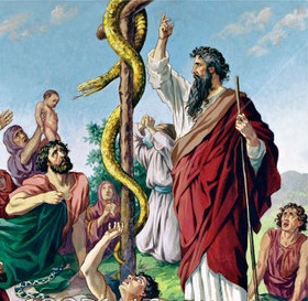 | Then H’ said to Moses, “Make a seraph figure and mount it on a standard. And anyone who was bitten who then looks at it shall recover.”