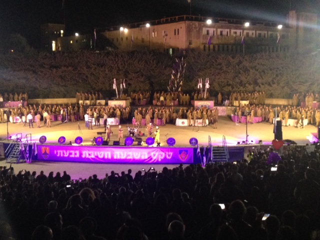“It’s especially poignant that we are here today, as this week’s Torah portion talks about the spirit of voluntarism, when it describes our People getting together to build the mishkan”. I’m at an outdoor amphitheater on a breezy Thursday evening as the sun is setting on the Judean Hills. The speaker is one of the IDF’s rabbis. The occasion: the swearing in of new soldiers into the Giv’ati infantry brigade. There are hundreds, maybe thousands of family members, relatives and friends around us, and about 500 soldiers on stage. One of them – you see, the tall, handsome one, in the back row, center stage?? That one is mine.