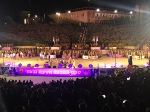 I love the view here, but this time, am much more involved with what’s happening on the stage. The next speaker now continues and quotes from the TaNaCh (Bible), reading Joshua 1:1: “Be strong and courageous”, said the leader of long ago – repeating these words three time within mere 9 verses, as if we didn’t catch it the first times. The topic then is inheriting the land, and yet the focus is – not letting go of the Torah “day and night” (1:8). As a mark of this “unthinkable contradiction, which only you can hold and can only exist in you”, per Giv’ati’s commander, each soldier is entrusted with his personal gun – and a TaNaCh. The crowd is asked to rise up for Hatikvah, singing in choked voices, watching the sky with glistening eyes. Indeed, we are a people of contradiction and that is who we are.