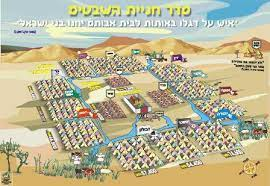 | We will deal here briefly with one of them, the one dealing with the matter of the “tzaru’a”, wrongly translated as leper. But we will first describe the structure of the Camp when the Children of Israel were in the desert. The camp was organized into three sub-camps, in that order from the inside out: Shechinah Camp – the innermost camp of the Divine Presence; The Levite Camp, around the Mishkan, where the Levites were, and finally, the Israelites Camp, the outermost. This section was divided to the four directions of heaven and in each of them, there were 3 of the tribes: Judah, Issachar and Zebulun in the east, Asher, Dan and Naphtali in the north, Benjamin, Ephraim and Menasheh in the west, and Reuben, Simeon and Gad in the south. | נעסוק כאן בקיצור באחת מהן, זו הדנה בענין “הצרוע”. לצורך כך, נתאר קודם את מבנה מחנה בני ישראל כשהיו במדבר. המחנה אורגן בשלושה מחנות, בסדר זה מבפנים החוצה: מחנה שכינה – המחנה הכי פנימי של הנוכחות האלוהית; מחנה לוויה, סביב המשכן, שם היה אזור הלויים, ולבסוף, מחנה בני ישראל, החיצוני ביותר. חלק זה חולק לארבע כיווני השמים ובכל אחד מהם, היו 3 מהשבטים: יהודה, יששכר וזבולון במזרח, אשר, דן ונפתלי בצפון, בינימין, אפרים ומנשה במערב, וראובן, שמעון וגד בדרום. |