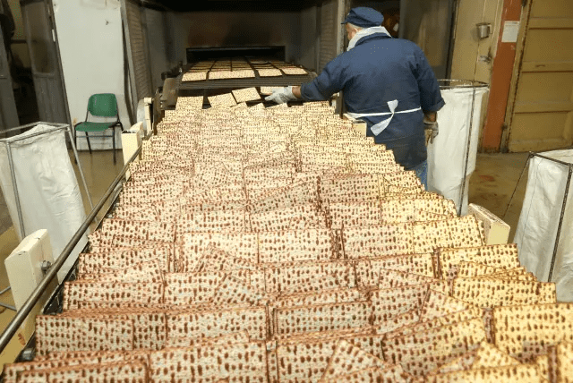 | In Israel, until the 1940s, matzah was made manually, then Rav Kook approved machine making matzah, and production changed accordingly. The matzah factories operate all year round, and the preparation of the matzah for Pesach begins already after Sukkot. In an article from 2018, the VP of Matzot Aviv, Roi Wolf, said that they produce close to a ton of matzah per hour! Besides selling them in Israel, Matzot Aviv is sent to about 40 countries around the world. | בארץ, עד שנות ה-1940, מצות יוצרו באופן ידני, ואז הרב קוק אישר לייצר מצות עם מכונה, והייצור שונה בהתאם. מפעלי המצות פועלים כל השנה, והכנה המצות לפסח מתחילה כבר אחרי סוכות. במאמר ב-2018 אמר סמנכ”ל מצות אביב, רועי וולף, שהם מייצרים קרוב לטון מצות בשעה! מלבד מכירתן בארץ, מצות אביב נשלחות לכ-40 מדינות ברחבי העולם. |