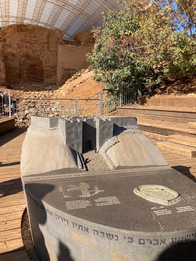 | The Canaanite city gate and the rampart around the mound (1550-1750 BCE). The gate includes an opening in the shape of a brick arch that has been preserved in its entirety, two towers on both sides – one facing the city and the other facing the outer side – and two cells on each of its two sides (gate 4 spaces ). The passage through the gate is 10 meters long and consists of stairs that go up to it on both sides and on the inside, it connects to a street from that era. The Dan city gate (known as the “Three Arches Gate”) is the oldest complete city gate discovered in the world, and it seems to have survived because for an unknown reason, it got covered with dirt and actually served as a base for the battery that was built on it. This discovery is of enormous importance, because until the discovery of the gate in 1979, researchers believed that there were still no arches in the Canaanite period. | שער העיר הכנעני ואת הסוללה סביב התל (1550-1750 לפנה”ס). השער כולל פתח בצורת קשת לבנים שהשתמרה בשלמותה, שני מגדלים משני צדדיו – האחד פונה אל העיר והאחר פונה אל צידה החיצוני – ושני תאים בכל אחד משני צדדיו (שער 4 מרחבים). המעבר דרך השער הוא באורך של 10 מטרים והוא מורכב ממדרגות העולות אליו משני הצדדים ובצד הפנימי חובר אל רחוב מהתקופה. שער העיר דן (המכונה ” שער שלוש הקשתות”) הוא שער העיר השלם הקדום ביותר שהתגלה בעולם, ונראה ששרד מכיון שמסיבה בלתי ידועה, כוסה בעפר ושימש למעשה גרעין לסוללה שנבנתה עליו. לגילוי זה חשיבות עצומה, עד גילויו של השער בשנת 1979 סברו החוקרים שבתקופה הכנענית עדיין לא היו קשתות. |