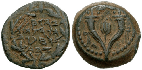 ” יהוחנן כהן גדול חבר היהודים” (באלפבית עברי עתיק). מטבע מהתקופה החשמונאית בארץ ישראל, מיוחס ליוחנן הראשון או השני. המאה השנייה לפני הספירה